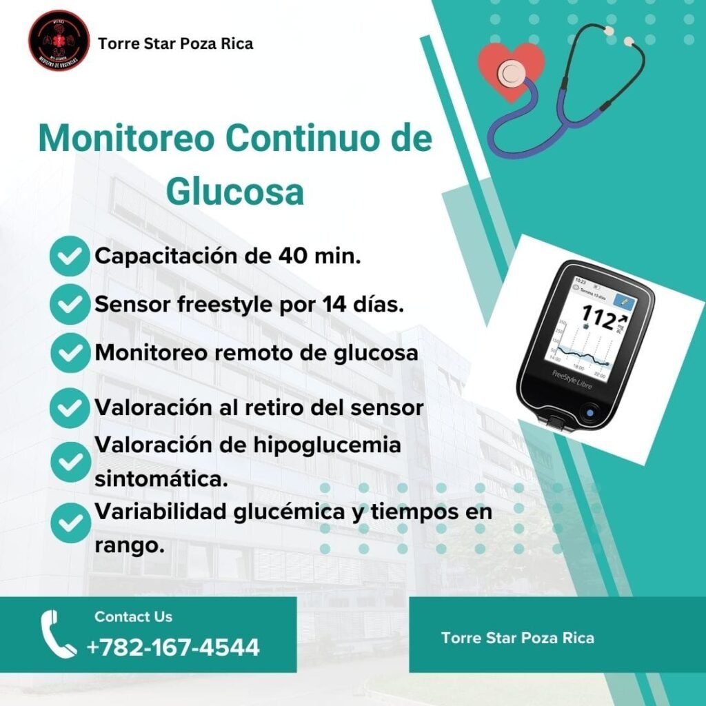 Monitoriza tu Glucosa intersticial de forma continua con una correlación con tu glucosa capilar durante 14 días Continuos (Puedes hacer deportes, nadar o bañarte sin alterar su funcondimento, monitoreo remoto de tu glucosa desde mi plataforma con tu sensor. Puedes realizar anotaciones de dosis de insulina o medicamentos que tomas o de tus alimentos. Recomendado por la Asociación Americana de Diabetes 2025 ya que se ha demostrado ayuda a reducir la hemoglobina glucosilada, disminuye la incidencia de hospitalización por hiper o hipoglucemia, reduce complicaciones agudas y crónicas de la diabetes. Al final de los 14 días obten un informe médico de 16 hojas con Glucosa promedios, eventos de hipoglucemias, tiempos en rango, arriba de rango y abajo de rango así como variabilidad glucémica e indicador de control de glucosa (GMI) que nos estima la hemoglobina Glucosilada.